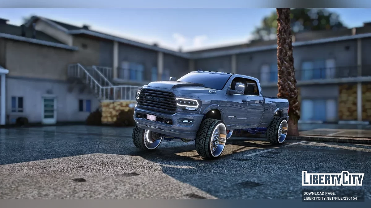 GTA 5 için özel Ram 3500 Kamyonu. Ön Kısım: Entegre LED şeritleri ve ek koruma unsurları ile donatılmış büyük çelik kanguru barı, off-road ve agresif bir görünüm kazandırıyor. Yatay lamelere sahip büyük dikdörtgen ızgara ve entegre LED farlar, g...