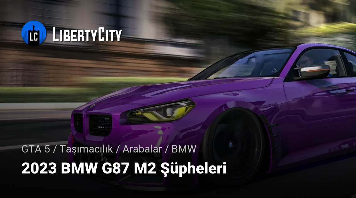 2023 BMW G87 M2, Şüpheler versiyonu, dikkat çekici ve şık bir tasarıma sahip bir otomobil. Mor gövde rengi, dikkatleri üzerine çekiyor ve sportif karakterini vurguluyor. Agresif hatlar ve genişletilmiş tekerlek kemerleri ile spor tamponlar gibi aerodinamik unsurlar, araca dinamik bir görünüm kazandırıyor. Dar farlar ve karakteristik ızgara, modern ve cesur bir görünüm oluşturuyor. Alçak profil ve büyük tekerlekler, güçlü ve kendine güvenen bir otomobil imajını tamamlıyor.