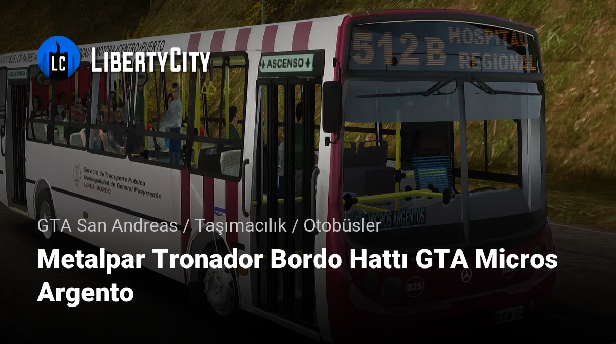 Metalpar Tronador Bordo Hattı GTA Micros Argento — GTA San Andreas oyununda kullanılmak üzere tasarlanmış şık ve güvenilir bir şehir otobüsüdür. Şık bordo rengi ve modern tasarımı dikkat çekiyor ve oyun deneyimine gerçekçilik katıyor.