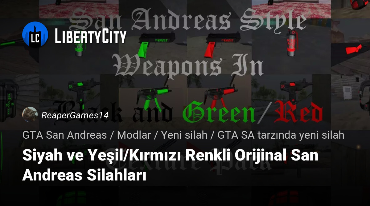 Siyah ve Kırmızı/Yeşil Renkli Orijinal San Andreas Silahları, temel oyundaki çoğu orijinal silaha yeni siyah ve yeşil veya siyah ve kırmızı dokular ekleyen bir modifikasyondur. Her doku, orijinalin klasik hissini korurken San Andreas tarzına dikkat edilerek tasarlanmıştır ve taze, şık bir görünüm eklenmiştir. Bu paket, tanınabilir temel tasarımı korurken modern, cesur renklerle silahların görsel görünümünü güncellemek isteyenler için mükemmeldir.