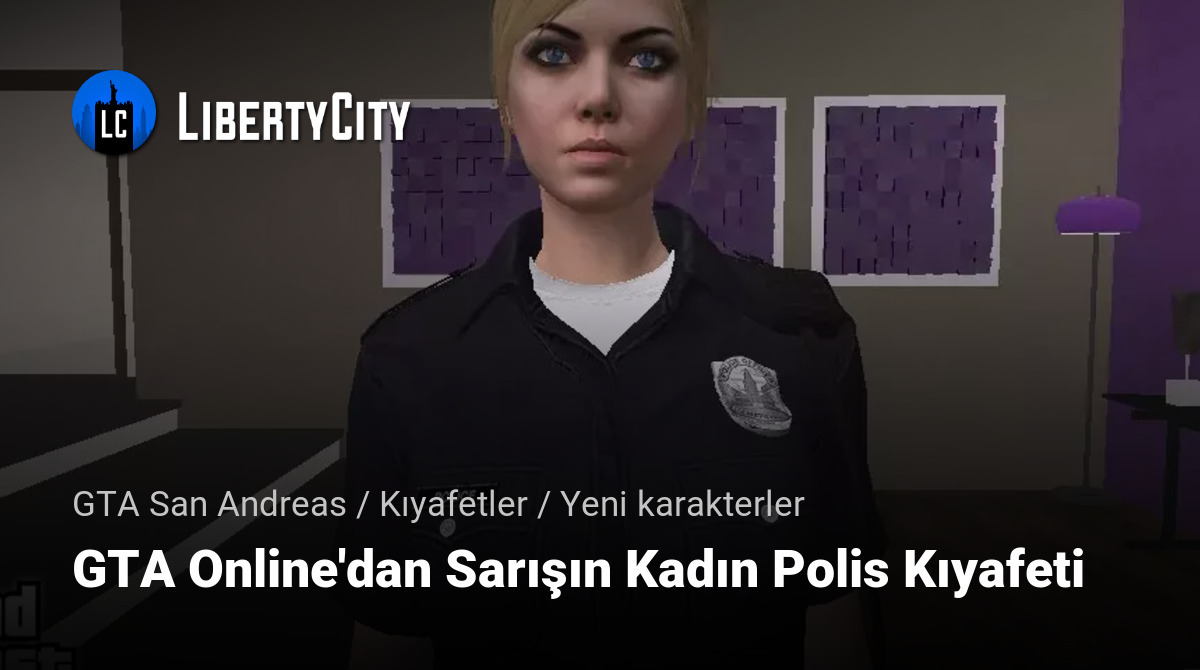 Size bir başka sarışın kadın polis memuru kıyafeti sunuyorum GTA San Andreasiçin! Bu kıyafet, GTA Online'dan bir polis üniformasınadayanmaktadır, ancak GTA San Andreasiçin uyarlanmıştır. Hem Android hem de PCile uyumludur ve oyunun ortamına mükemmel bir şekilde uyum sağlar.
